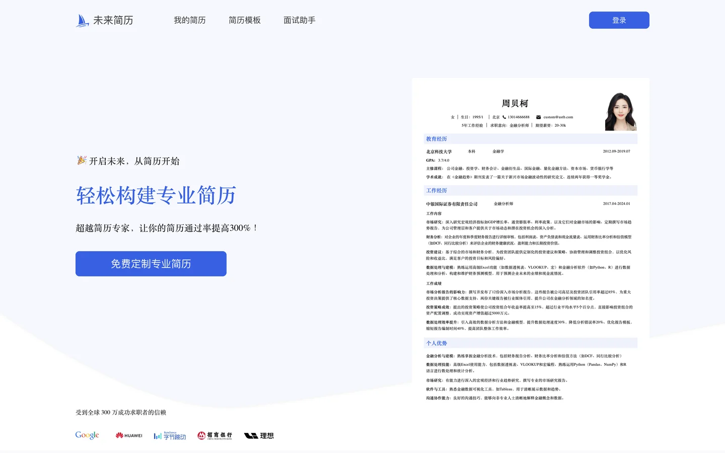 未来简历是一个革命性的AI简历构建工具,它结合了最新的人工智能技术和人力资源专业知识,为求职者提供量身定制的简历制作服务。这个工具的亮点有很多,但让我们来看看最吸引人的几个方面: 核心特色: 1.GLM-4智能定制:采用业界领先的大模型技术,深度分析求职者的职业经历和求职意向。它能够自动纠正语言错误、应用STAR法则、量化您的成就,并填充精选的简历模板。我们超越了传统的写作方式,以更专业的方法展现您的职业生涯。 2.免费模板库:提供了一个丰富多样的模板库,涵盖金融、IT、创意等多个行业,以满足各种职业背景的需求。我们的设计团队精心制作了一系列简历模板,确保您的简历在美观的同时,也符合行业标准。 3.友好的编辑工具:简易编辑工具也能帮助您轻松制作出专业级别的简历。通过简单的拖拽和点击操作,您可以在几分钟内完成简历的制作,让制作过程更加高效和顺畅。 探索未来简历,开启您职业生涯的新篇章。我们在这里,帮助您以最佳的方式呈现自己。