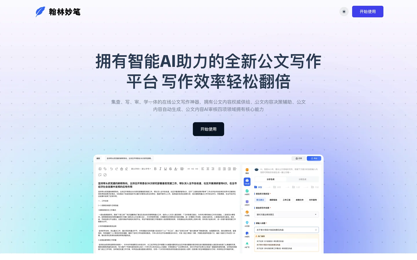欢迎来到翰林妙笔——您的智能公文助手! 在繁忙的工作中,公文写作往往占据了公职人员、事业单位、国企人员以及医院、学校等机构工作人员大量的时间和精力。翰林妙笔诞生的意义就在于解决这一难题,它是一款专注于公文写作的智能AI创作平台,致力于提供全面的写作、校对、润色及模板服务,帮助您高效完成各类公文材料的创作。 ### 核心服务 #### 全面写作支持 翰林妙笔提供了一个集查、写、审、学于一体的在线公文写作环境。无论您需要完成述职报告、调研报告、工作总结还是年终总结,我们的平台都能提供相应的支持。我们的智能写作工具能够根据您的需求自动生成公文内容,大大减少您的工作负担。 #### 权威内容供给 我们的平台拥有权威的公文内容供给能力,确保您创作的每一份文件都具备必要的专业性和权威性。 #### 决策辅助 翰林妙笔还能提供公文内容的决策辅助,帮助您在公文内容的选择和表达上做出更加明智的决策。 #### 自动化审核 我们的AI审核工具确保了文件内容的一致性和信息的准确性,无论是内部报告还是外部通信,都能得到精确、一致的处理。 #### 高效校对 AI校对工具以其超高的准确率,帮您捕捉每一个细微错误,确保您的文本清晰、专业。 ### 丰富的资源库 翰林妙笔拥有丰富的公文写作素材、范文和模板数据库,这些资源将进一步提高您的写作效率。我们的平台不仅能帮助您提效降本,还能通过知识赋能,提升您的写作技能。 ### 用户体验 为了让您享受无忧的写作体验,翰林妙笔特设了一键式操作。只需简单点击,AI生成、AI润色、AI校对、AI续写、AI灵感等功能都将立刻为您服务。 ### 结语 翰林妙笔——您的智能公文写作伙伴,让公文写作变得更加高效、专业且无忧。现在就来体验翰林妙笔,开启您的智能写作新篇章!