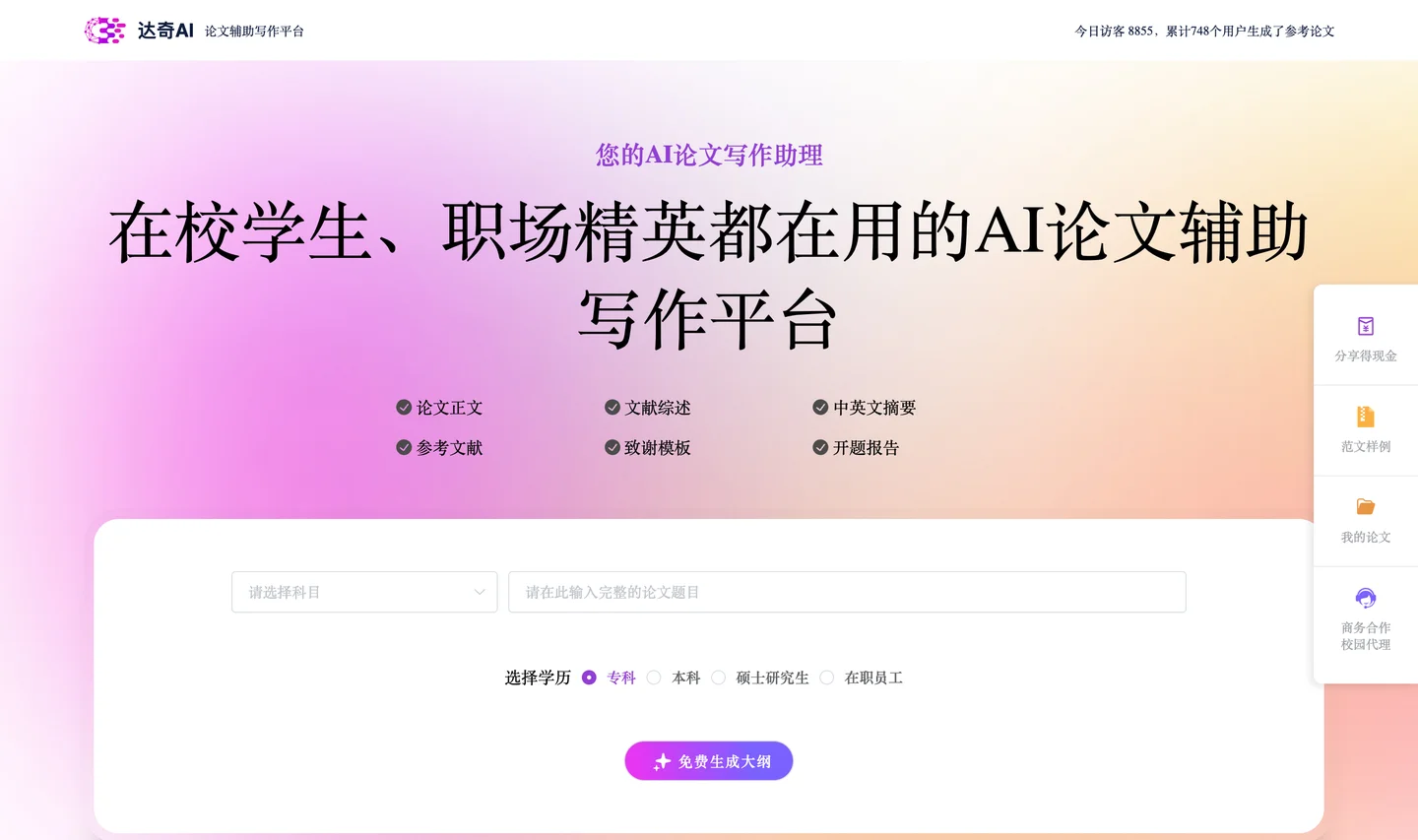 达奇AI论文辅助写作平台,在校学生、职场精英都在用的AI论文辅助写作平台 平台简介: 达奇AI论文辅助写作平台是一款集成了先进人工智能技术的AI平台,专为在校学生、职场精英量身打造。该平台通过深度学习和自然语言处理技术,为用户提供高效、智能的论文写作支持。 达奇AI论文辅助写作平台的核心优势在于其强大的智能写作功能和丰富的学术资源。平台能够根据用户输入的选题方向和研究方向,自动生成免费论文大纲。 同时,平台提供了直观易用的编辑界面,用户可以在此界面中编辑和修改论文的大纲内容,在用户明确大纲的基础上以科学、逻辑的方式组织论文结构,并填充具体的内容。 AI论文使用步骤: 一、选择专业,输入论文主题,免费生成论文大纲 二、修改编辑大纲,可增加、删减童节,修改章节内容 三、生成论文全文 四、下载论文文档 总之,作为一个高效、便捷的论文辅助写作平台。无论是在校学生还是职场精英,都可以在这个平台发挥创作灵感。 本平台提供的论文内容仅供用户参考和学习之用,严禁任何形式的抄袭、代写等违规行为。用户在使用本平台时,应自觉遵守学术规范和道德准则,确保论文的独立性和原创性。