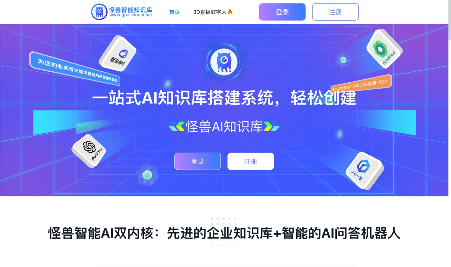 怪兽AI知识库大模型 大模型,知识库,问答回复,AI写作,智能客服 网址:https://www.guaishouai.net/ 企业知识库大模型 + 智能的AI问答机器人 零代码搭建企业知识库平台,团队多人协同与权限管理,智能回复 第三方集成:集成在网站、小程序、公众号、淘宝客服、京东客服 一站式AI知识库搭建系统,轻松创建企业知识库大模型,智能客服,智能问答,AI写作