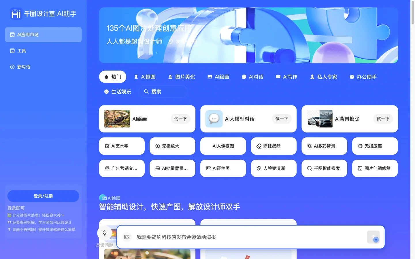 AI辅助图片处理,让设计效率提升30%,包含抠图/AI绘画/AI对话等50+工具,人人都是超级设计师
