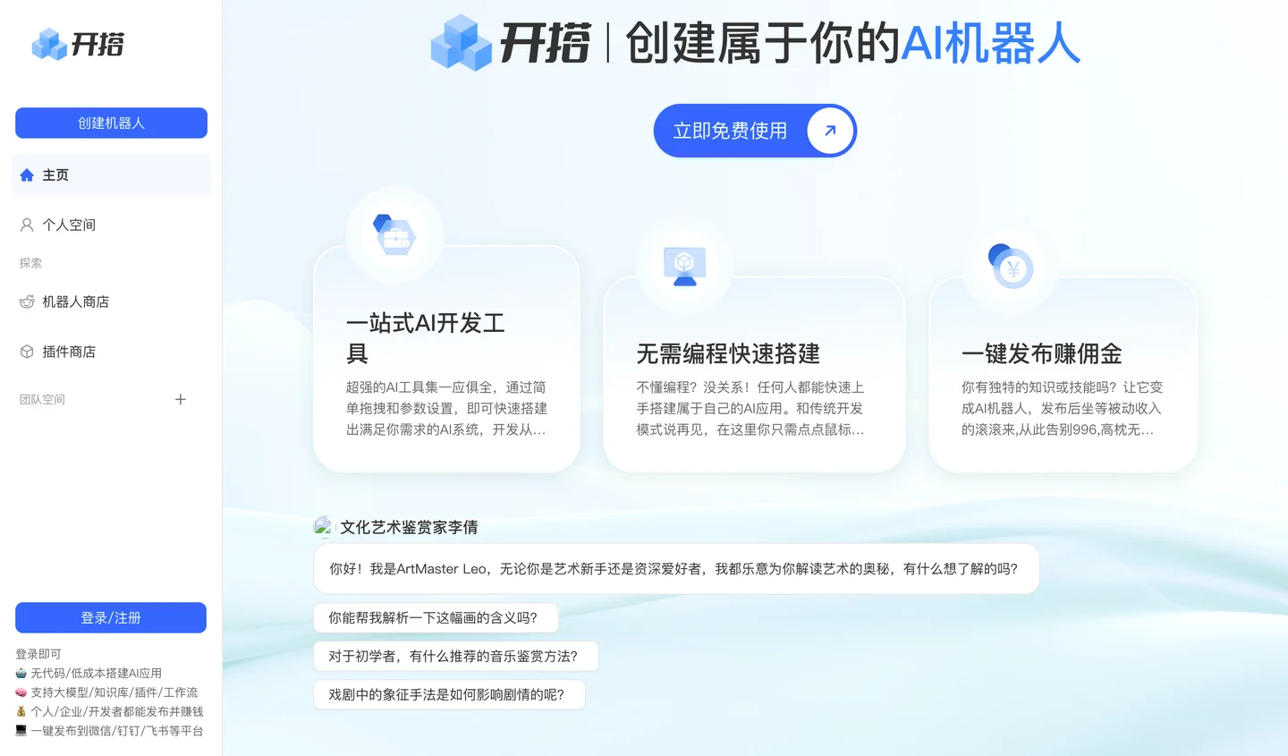 创建属于你的AI机器人,一站式AI开发工具 · 无需编程快速搭建 · 一键发布并能赚佣金