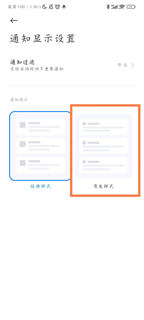 5、回到设置将通知显示设置改成原生样式。