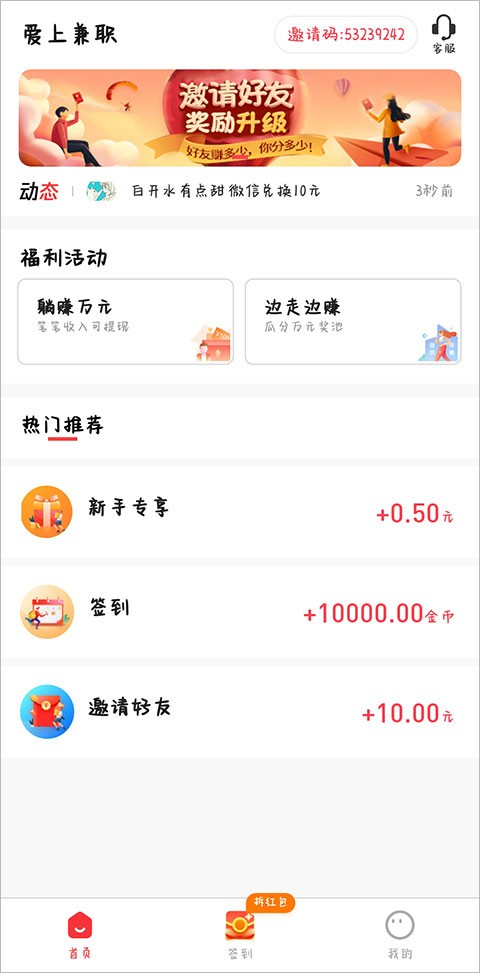 1、新人红包,首次登陆爱上兼职可领取现金红包,随时可提现。