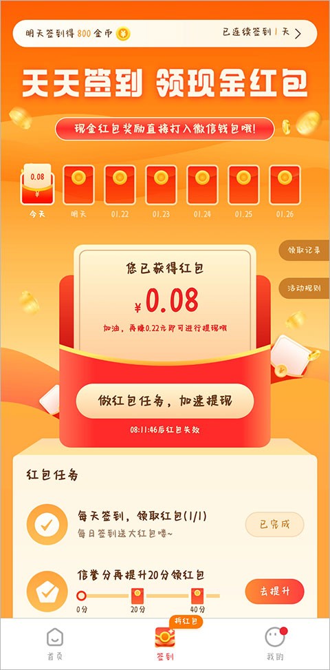 4、签到页面除了可以签到,下方还有很多红包任务;