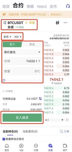 【交易】→【合约】→选择【BTC/USDT】→选择【全仓/逐仓】、【杠杆】、【买入】、【限价委托】→输入价格、数量→【买入/做多】→确认。
