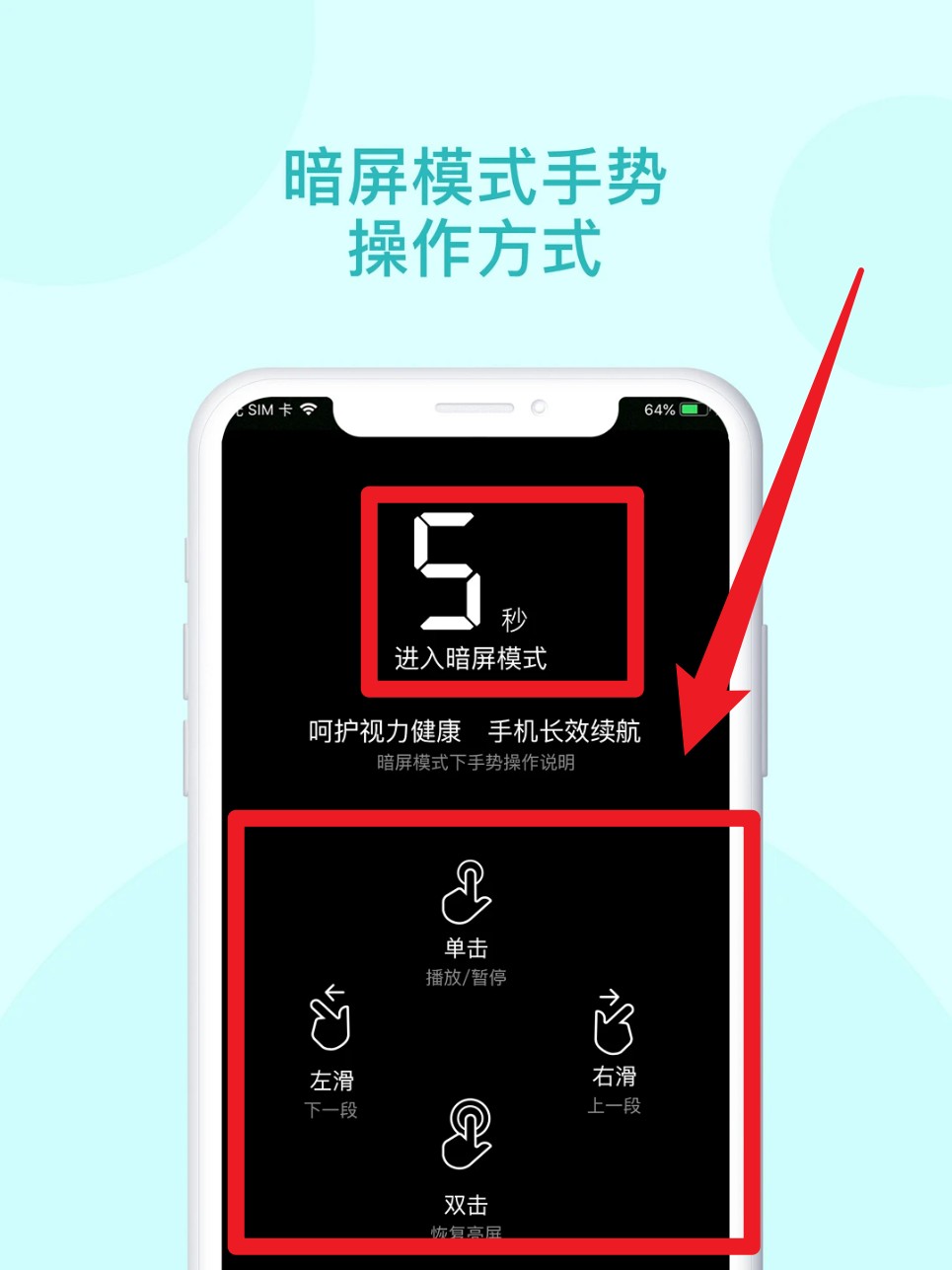 4. 若进入暗屏模式,可通过手势操作控制音频,如单击暂停、滑动切段等功能。