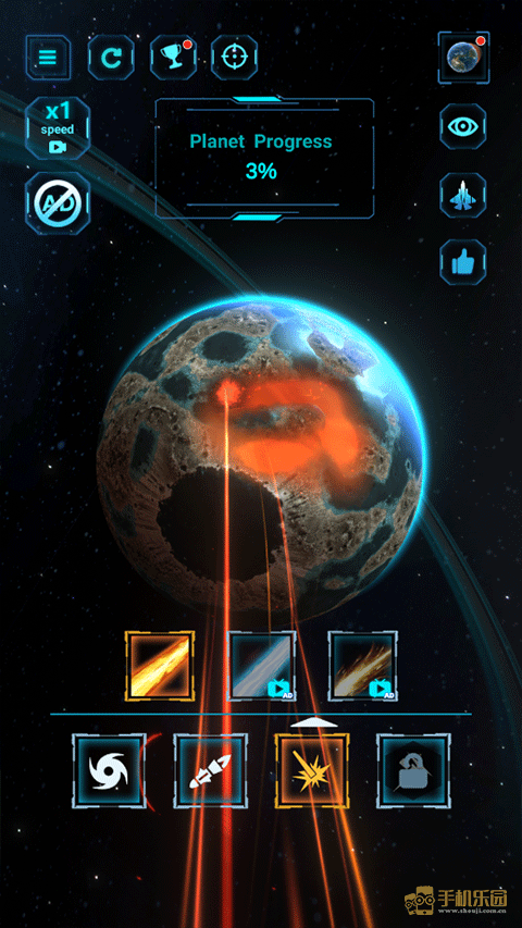 2、进入游戏后,玩法非常简单,玩家需要通过下方的激光以及道具来摧毁星球;