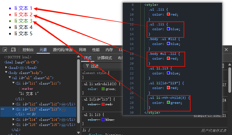 类选择器、属性选择器、伪类选择器权重相同。所以 ul li.li3 和 ul li[id="li3"] 和 ul li:nth-child(3) 优先级一样,也适用于,谁在后面谁最大。