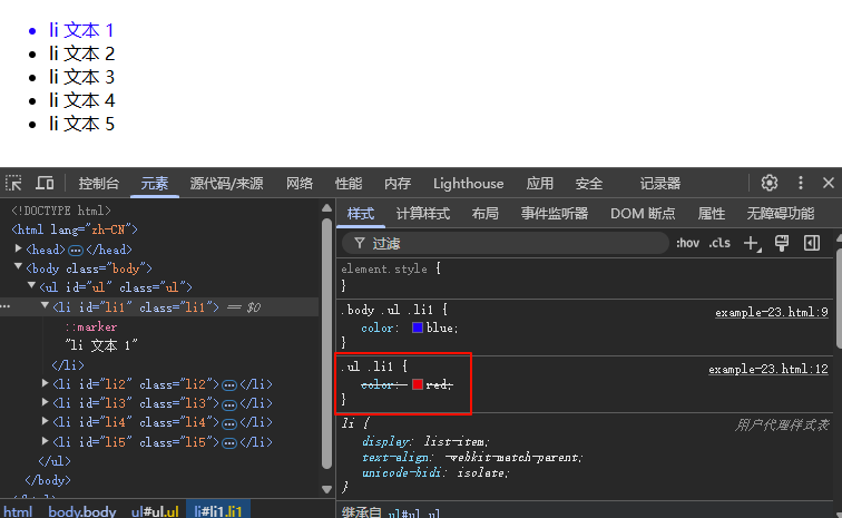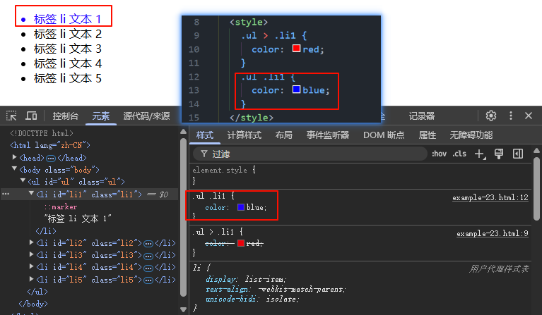 如 .ul > .li1 比 .ul .li1 好像多了一层,然而两者权重相同,写在后面的优先级高。