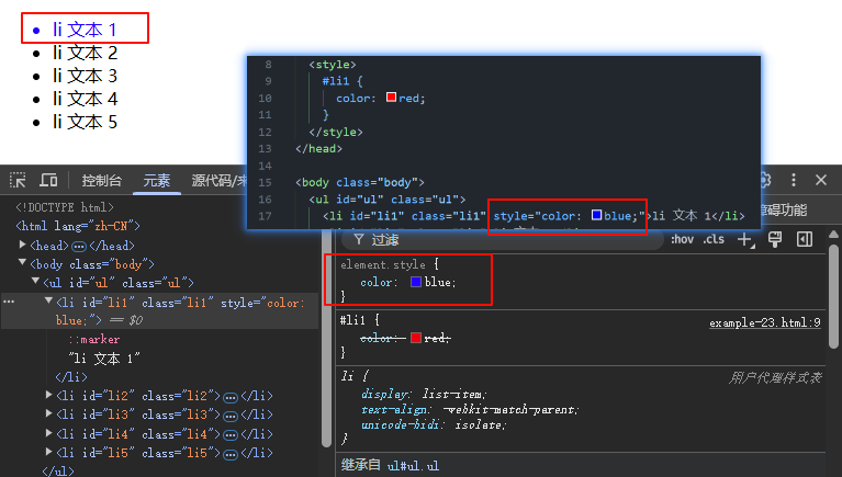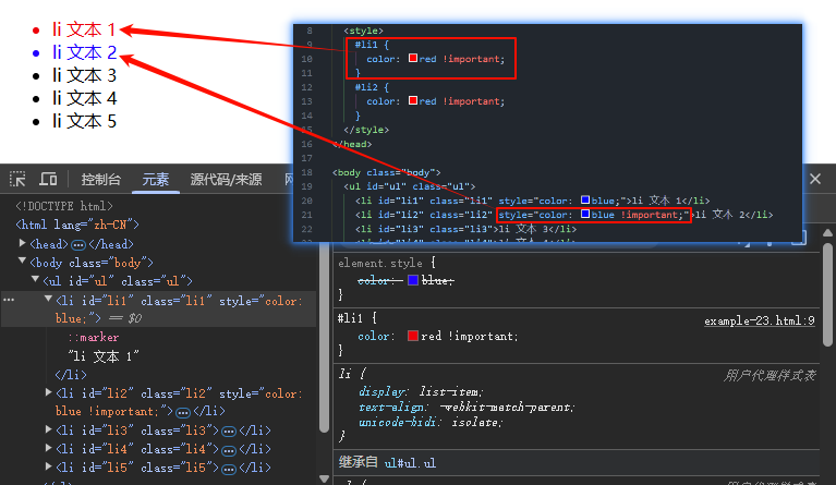 此规则也适用于交叉选择相同权重的选择器,如 .body .ul #li2 和 .body #ul .li2,权重计算结果都是 0,1,2,0,谁在后面谁最大。