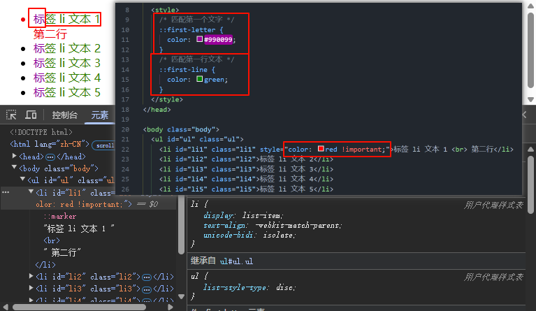::first-line 命中第一行文本,::first-letter 命中第一个字符,style="color: red !important;" 强制设为红色。
