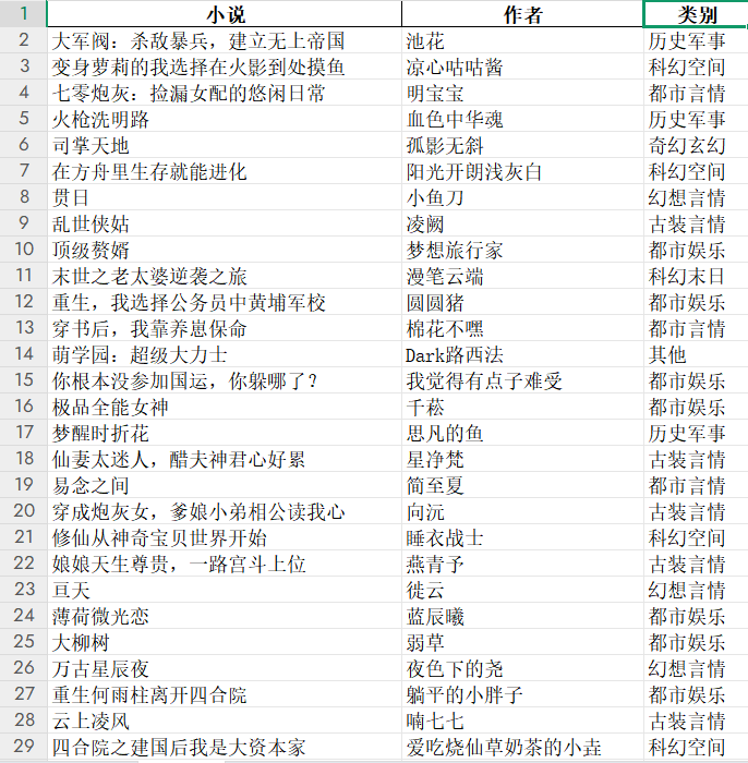 df = pd.DataFrame(data, columns=['小说', '作者', '类别'])