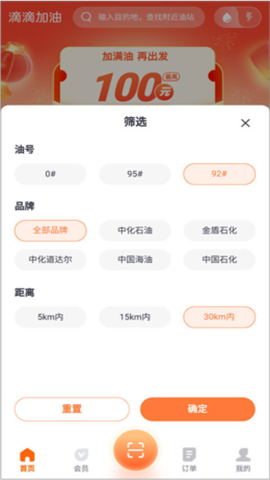 2、接着,点击【筛选】功能,按价格、距离、油号、优惠等条件精准查找附近的加油站或充电站;