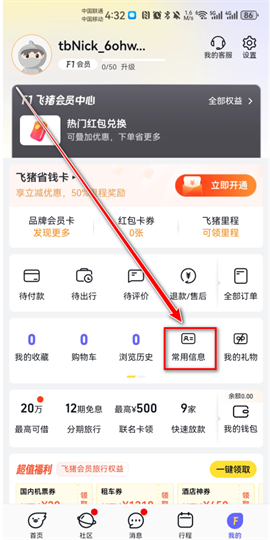 网页端:登录飞猪官网,进入【个人中心】→【常用信息管理】。