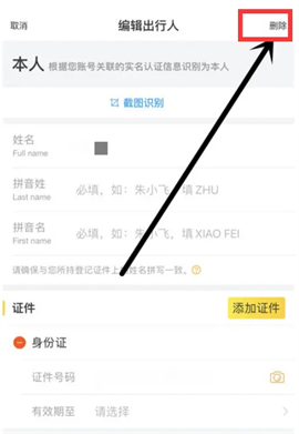 在“出行人”下方找到需要删除的乘车人。
