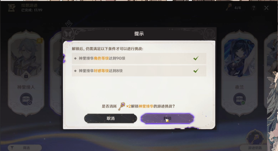 进入「幻想真境剧诗」→「剧演准备间」→触碰画布,选择神里绫华解锁挑战。